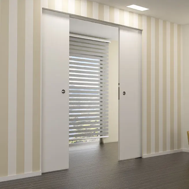 Schiebewandtür Ermetika EvoKit ohne Rahmen für zweiflügelige Schiebetüren ohne Rahmen. Eingebaute EvoKit-Boxen ohne Rahmenverkleidung eignen sich für Innenräume, in denen modernes und schlichtes Design mit klaren Linien groß… Mehr Anzeigen