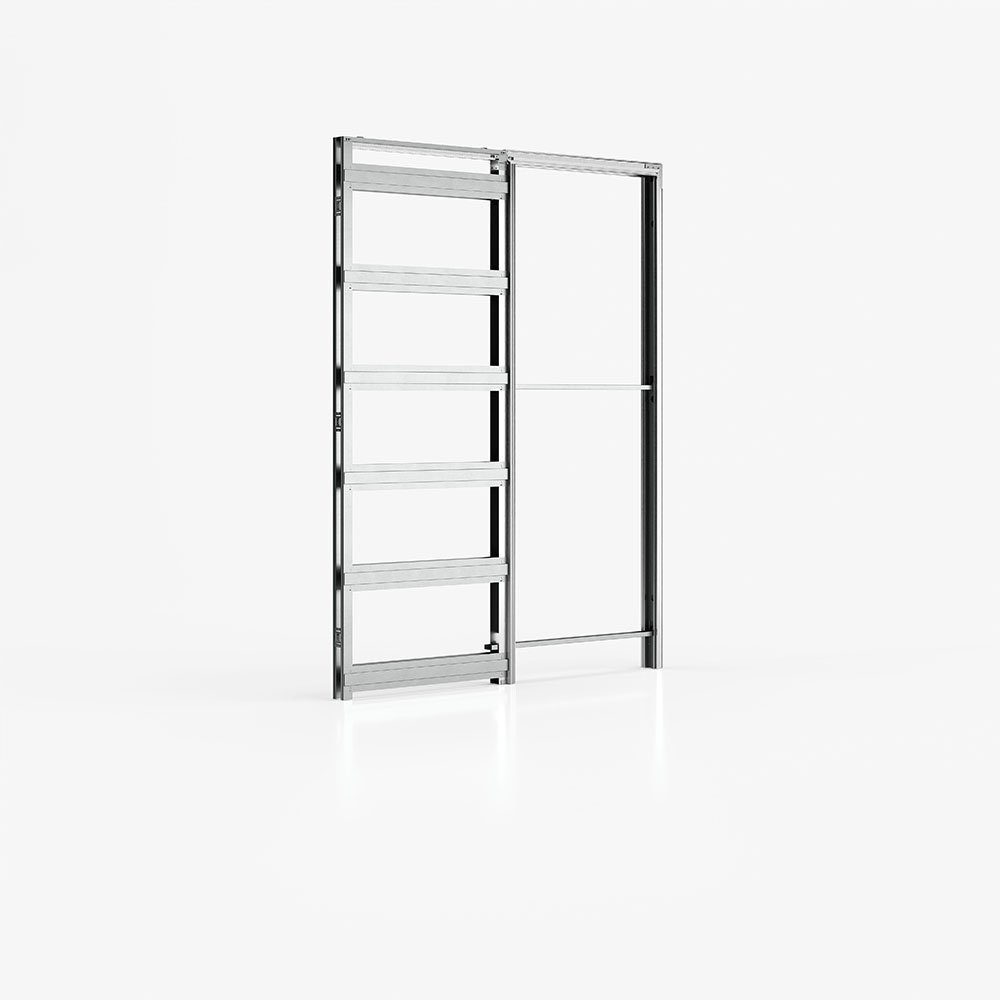 Die Schiebetür des blockfreien Ermetika Absolute Evokit-Baukastens besteht aus einem Türrahmen aus MDF-Material oder beidseitig beschichteten Fichtenholzlamellen mit CPL Premium-Laminatoberflächenbehandlung. Die wabenförmige Türeinlage verleiht der Schiebetür Leichtigkeit bei der Handhabung des Türblatts im Baukasten.